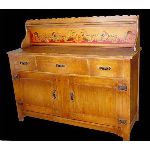 This hand painted Pennsylvania Dutch style country sideboard is extremely spacious, made of basswood and has its original hand painted flower foliate adorned bonnet top and bears its original wrought iron handles and matching butterfly hinges and would make a great addition to any fine household or collection. ****NOTE: Email for larger images.