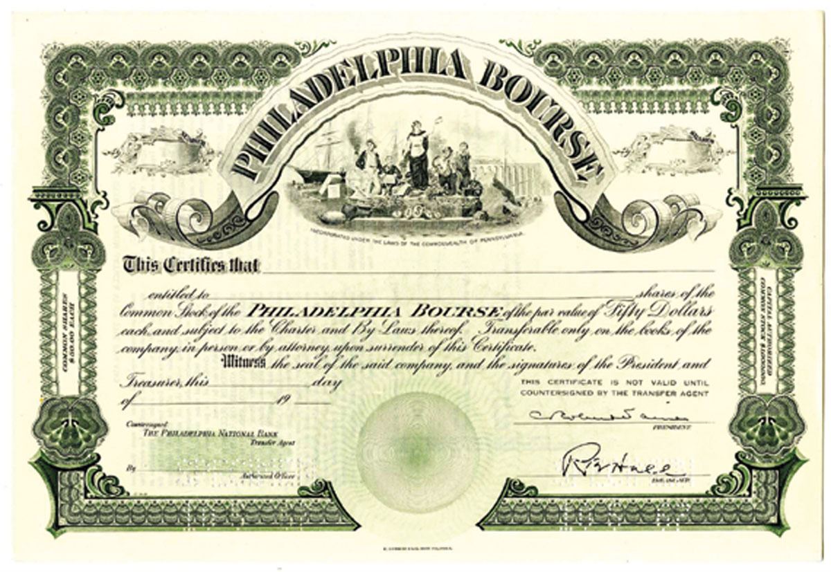 PA. Philadelphia Bourse, 1967 Odd Shrs Specimen Stock Cert. Unc EA WBN Green. Philadelphia Bourse was a commodities exchange founded in 1891 by George E. Bartol, a grain and commodities exporter, who modeled it after the Bourse in Hamburg, Germany. The Bourse stopped functioning as a commodities exchange in the 1960s. The structure continued to serve as an office building until 1979, when it was sold and renovated to include upscale retail space on floors near the street level. The upper levels of the building continued to house office space.