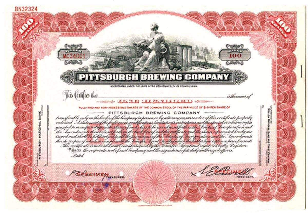PA. Pittsburgh Brewing Co., 1930s 100 Shrs Specimen Stock Cert., VF SCBN Red. Pittsburgh, PA. The Iron City Brewing Company (also known as the Pittsburgh Brewing Company) is a beer company that until August 2009 was located in the Lawrenceville neighborhood of Pittsburgh, Pennsylvania, United States. Prohibition, starting in 1920, forced many breweries, distillers and taverns to close, yet Pittsburgh Brewing Company survived. One of only 725 American breweries left when the movement was repealed in April 1933, PBC produced soft drinks, ice cream and 'near beer' and ran a cold storage business to endure those years.