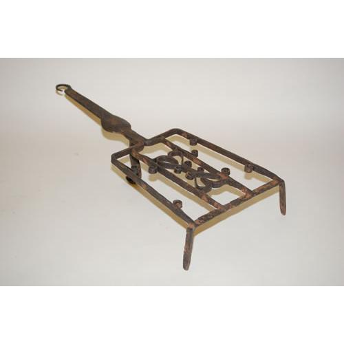 PA WROUGHT IRON TRIVET W/ HEARTS & SCROLLS ON 4 RIBS W/ SHAPED HANDLE & WROUGHT LOOP HANGER (4 1/4" T X 19 1/4" L W/ HANDLE X 9" W) - WEAR, OXIDATION, IMPERFECTIONS