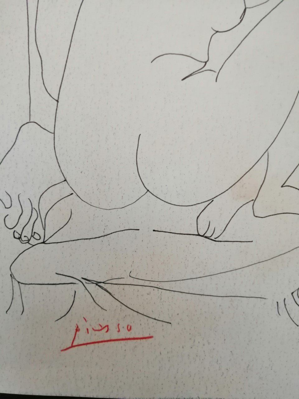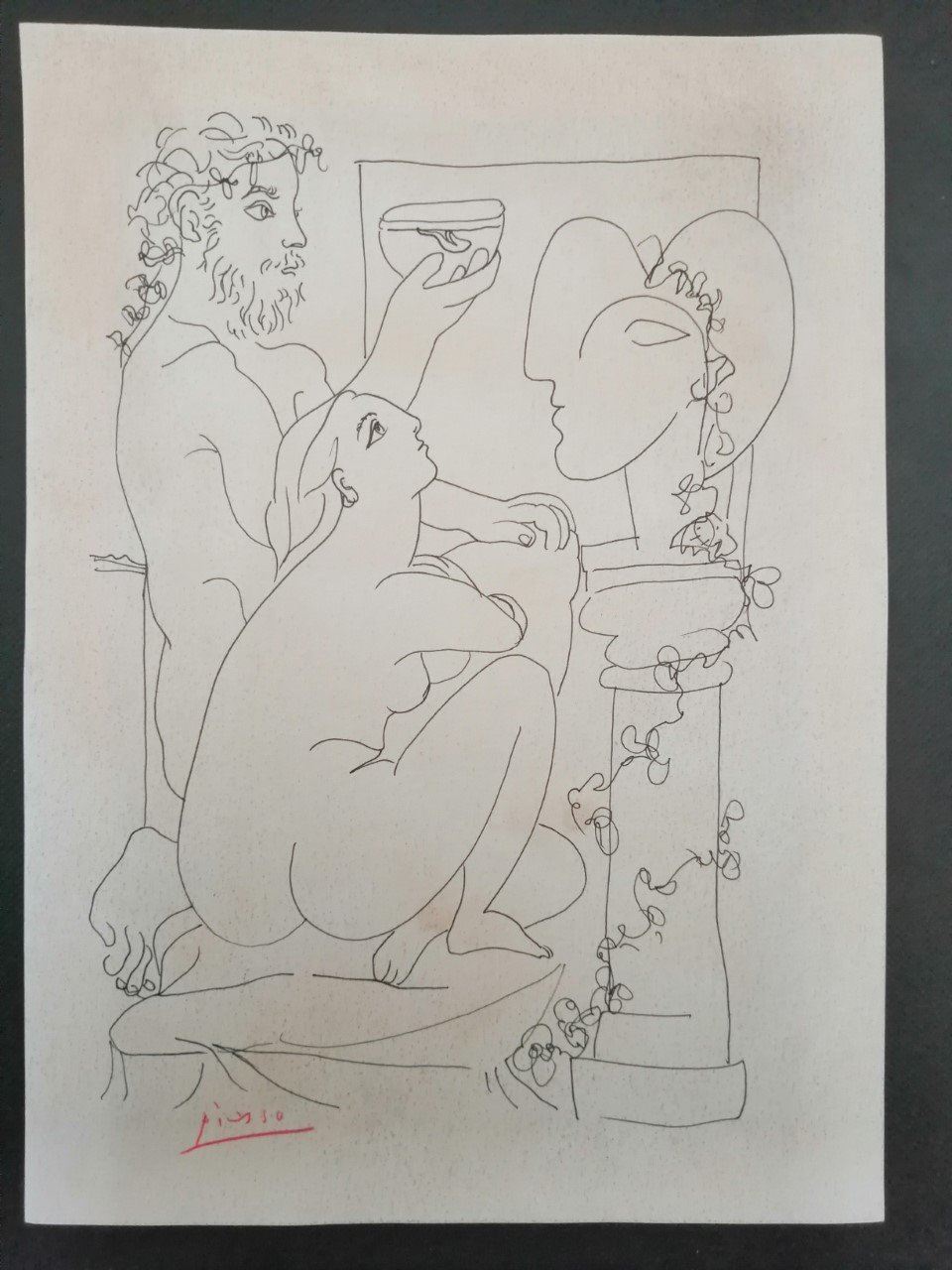 A drawing of the Gods by Spanish artist Pablo Picasso. Size: 12.75x9.25 inches. Signed by Pablo Picasso. Mounted and framed. Supplied with coa. In good condition with some age spots.