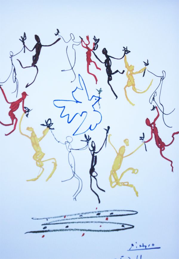 PABLO PICASSO ART **|**|** 24X36 INCHES; UNFRAMED; This poster is of Dance of Youth, by Pablo Picasso. It shows a circle of figures in black, yellow and red. They are holding hands in a circle and also holding olive branches. In the center is a dove with an olive branch in its mouth. Pablo Ruiz Picasso (October 25, 1881 - April 8, 1973) was a Spanish painter and sculptor. One of the most recognized figures in 20th century art, he is best known as the co-founder, along with Georges Braque, of cubism. Picasso's work is often categorized into periods : the Blue Period (1901-1904), the Rose Period (1905-1907), the African-influenced Period (1908-1909), Analytic Cubism (1909-1912), and Synthetic Cubism (1912-1919). ; MSRP: $1800