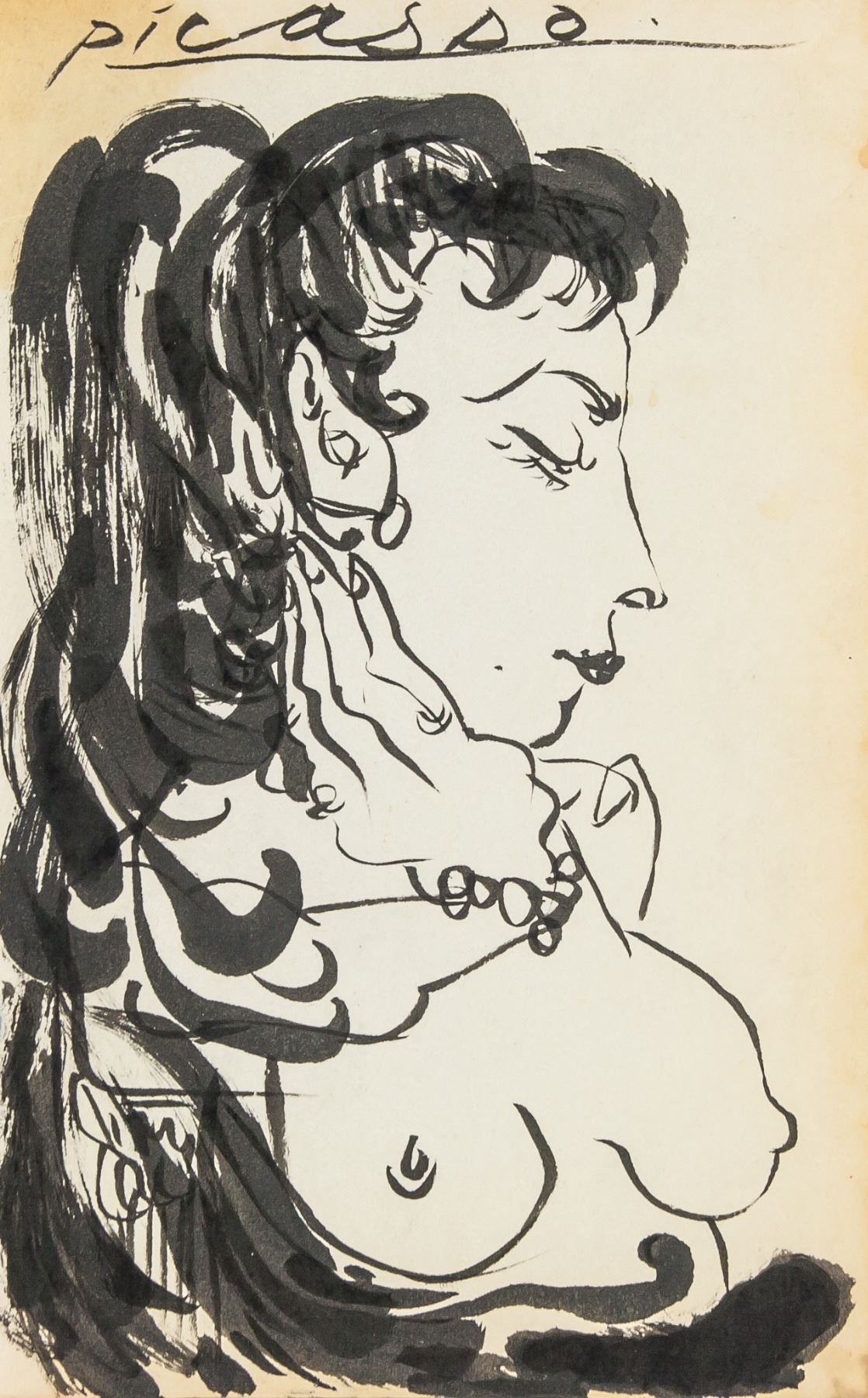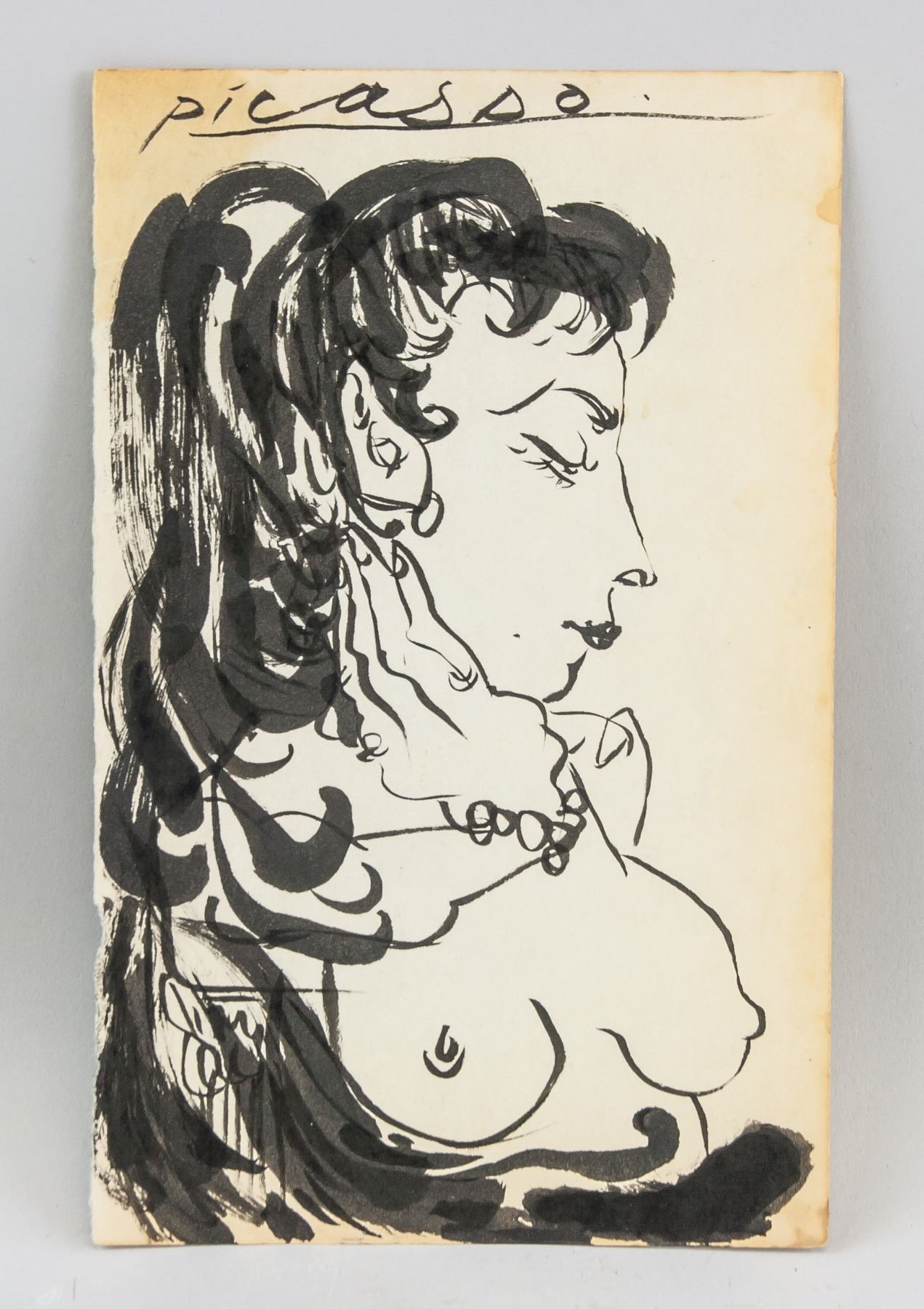 Ink on paper. Featuring a nude. Signed and attr. Pablo Picasso (Spanish, 1881-1973). 7.9 x 4.9 in. (20 x 12.5 cm). A prolific and tireless innovator of art forms, Pablo Picasso impacted the course of 20th-century art with unparalleled magnitude. Inspired by African and Iberian art and developments in the world around him, Picasso contributed significantly to a number of artistic movements, notably Cubism, Surrealism, Neoclassicism, and Expressionism. Along with Georges Braque, Picasso is best known for pioneering Cubism in an attempt to reconcile three-dimensional space with the two-dimensional picture plane, once asking, "Are we to paint what’s on the face, what's inside the face, or what’s behind it?" Responding to the Spanish Civil War, he painted his most famous work, Guernica (1937), whose violent images of anguished figures rendered in grisaille made it a definitive work of anti-war art. "Painting is not made to decorate apartments,” he said. “It’s an offensive and defensive weapon against the enemy." Picasso’s sizable oeuvre includes over 20,000 paintings, prints, drawings, sculptures, ceramics, theater sets, and costume designs. PROVENANCE: Private collection (Los Angeles, United States)
