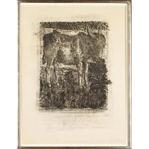 <B><BR>PABLO PICASSO (Spanish, 1881-1973)</B></I><BR><I>L'Ane (from Histoire Naturelle by Georges Buffon)</B></I>, 1936<BR>Etching with aquatint on laid paper<BR>16-3/8 x 12-3/8 inches (41.7 x 31.5 cm)<BR> Ed. 55<BR>Titled and signed in the plate: <I>L'ane Picasso</B></I><BR>Dated lower right: XXXVI