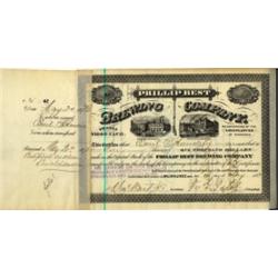 <b>292. FREDERICK PABST</b> (1836 - 1904) Brewer and founder of one of the world's largest brewing empires. Scarce D.S. 1p. 4to., Milwaukee, Wis., May 20, 1873, a stock certificate for one share in the Philip Best Brewing Company, the forerunner of what eventually would become the Pabst Brewing Company. A few light creases, light browning at extreme top margin, otherwise very good.<b>$300-400</b>