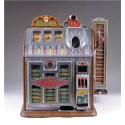 PACE BANTAM MINT VENDER. Cast aluminum front, five-cent, three-column vender features a side vender jackpot. Circa. 1933. SIZE: 17” w x 20” t x 13-1/2” d. CONDITION: Working original condition with original reel strips, and marquee. Slight paint loss to possible repaint. Missing key. PF 1-3158