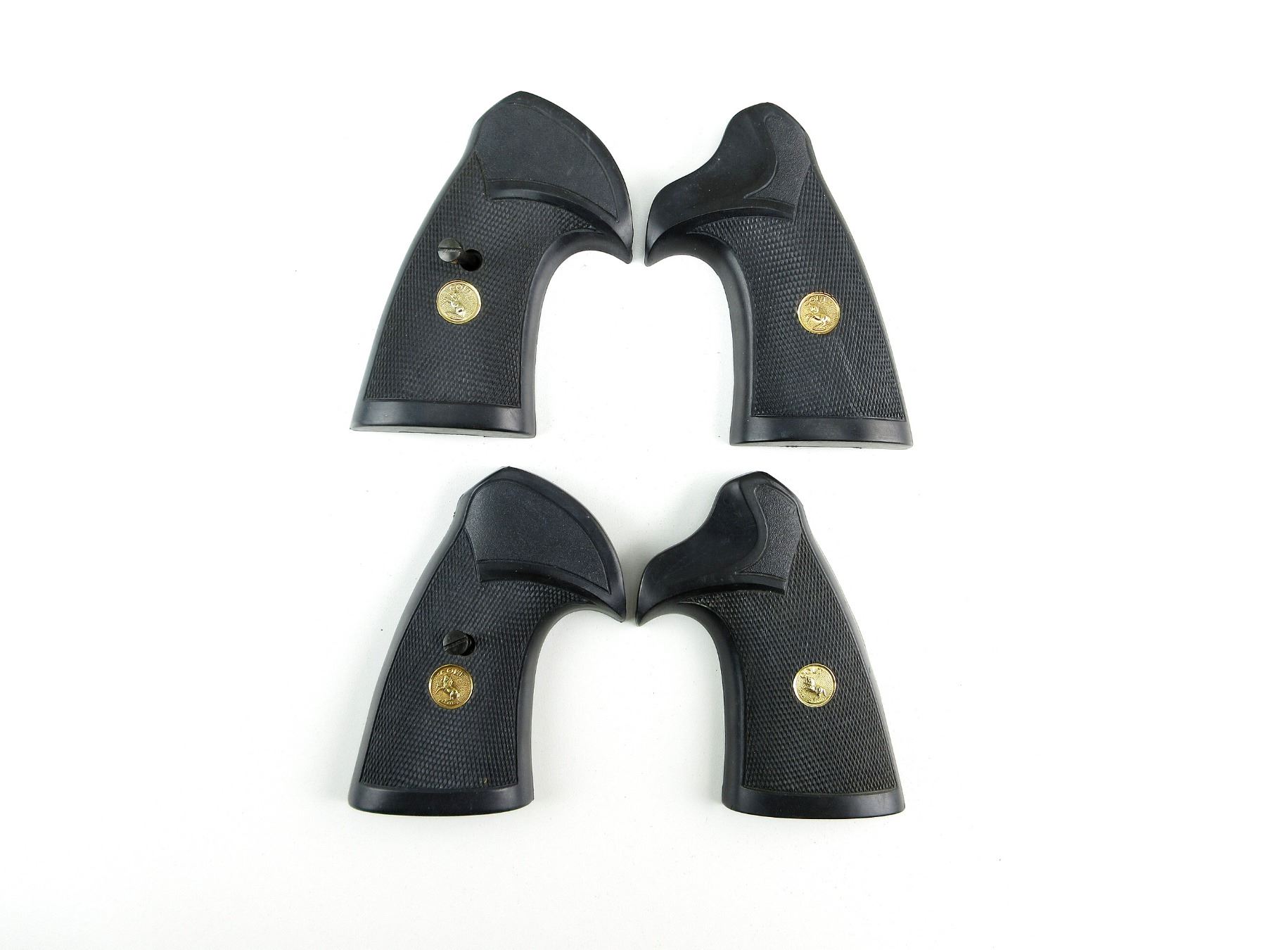 LOT INCLUDES; (2) SETS OF COLT D RUBBER CHECKERED REVOLVER GRIPS, WITH GOLD COLT LOGO & SCREW, OAL APPROX. 4.25". MAY REQUIRE FITTING. SEE PHOTOS.