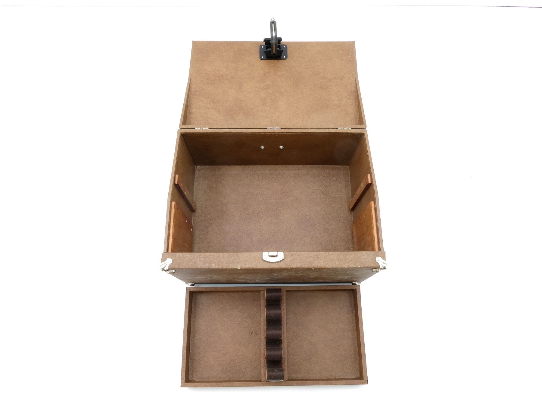 (1) WOODEN CONSTRUCTION, PULL-OUT TRAY, HOLDS 4 HANDGUNS, WITH LATCH CLOSURE & LOCK / KEY FUNCTION, MISSING KEY, WITH CARRY HANDLE, OVERALL LENGTH APPROX. 18" X 9.5" X 13.5". SEE PHOTOS.