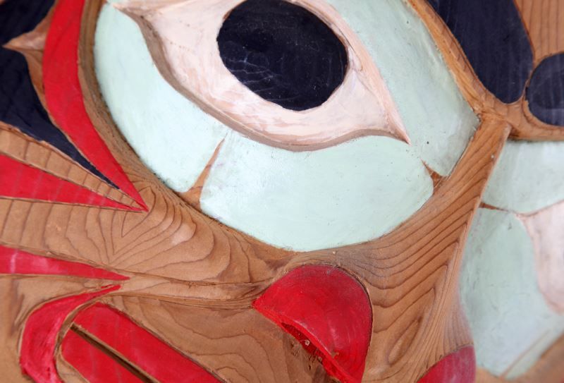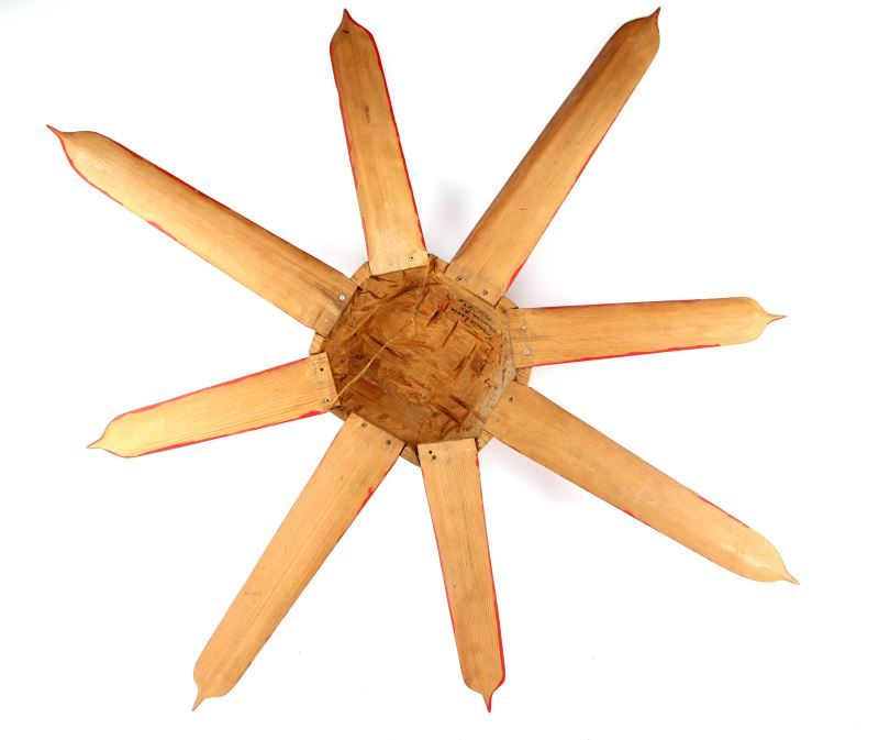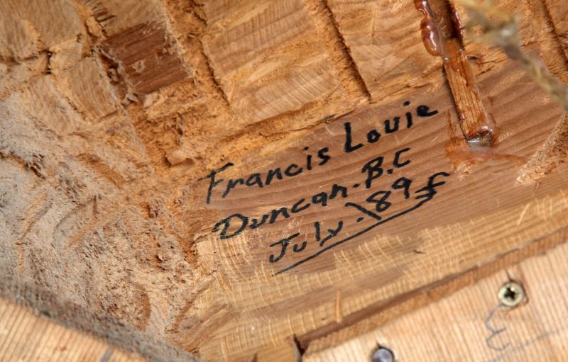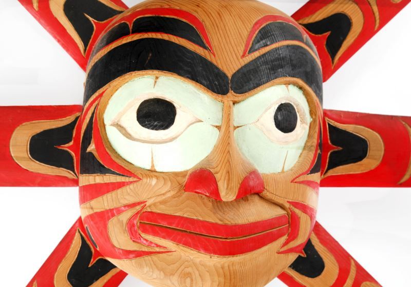 Native American Indian Sun mask hand-carved and painted cedar wood with black and red pigmentation with eight sunray bursts surrounding the central mask. Signed by Francis Louie, Duncan B.C. 07/89. Mask measures at 49 inches in diameter.