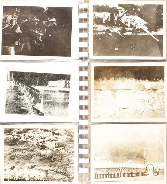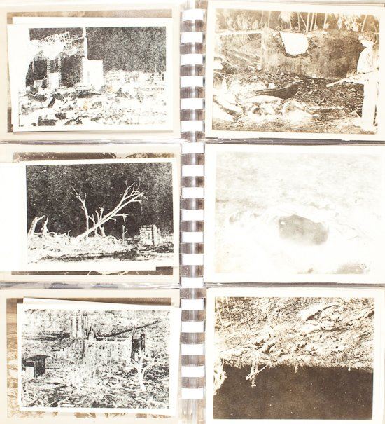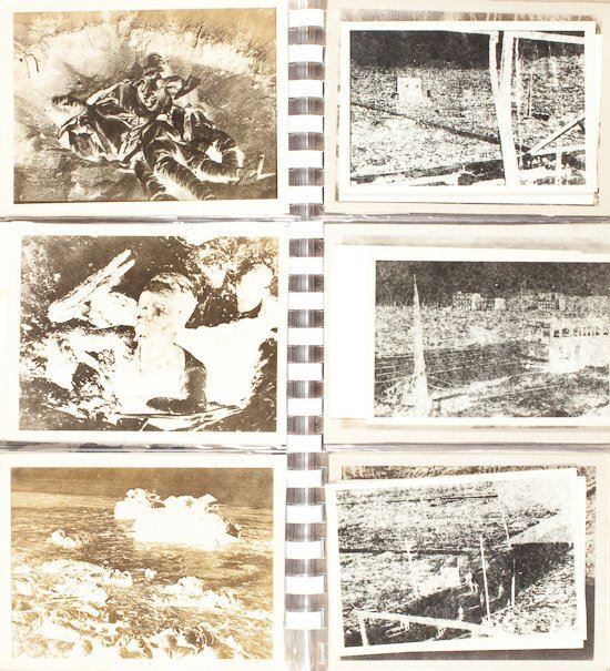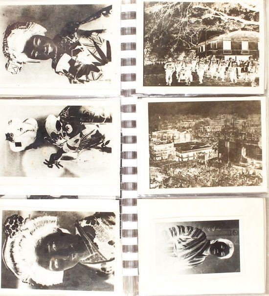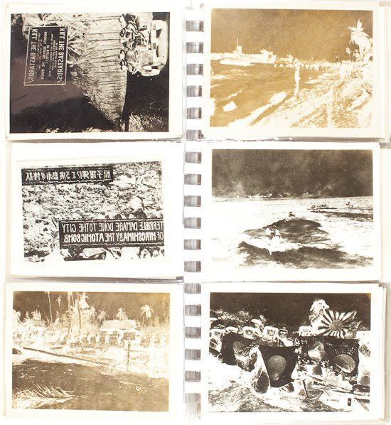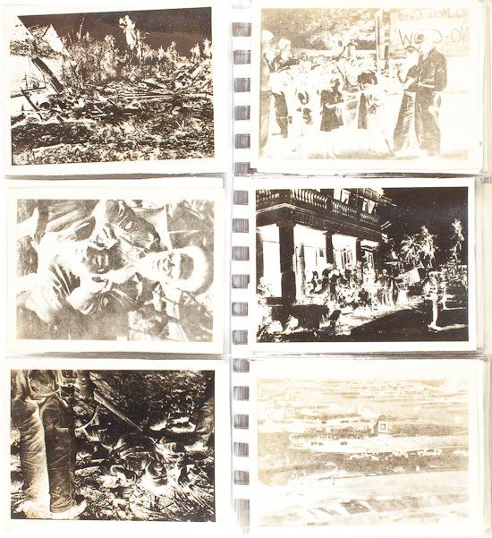 Collection of 52 contemporary 4 1/2" x 3 1/2" prints in negative of various World War II scenes from the Pacific Theater. These images were likely used in the production of postcard and similar-sized image for market and thus are contemporary to the times. They include Joe Rosenthal's famous image of the Iwo Jima "flag raisers", American and Japanese prisoners, Japanese dead, some incinerated, troop transports, destruction at Hiroshima, the surrender in Tokyo Bay, and more. Overall near fine.