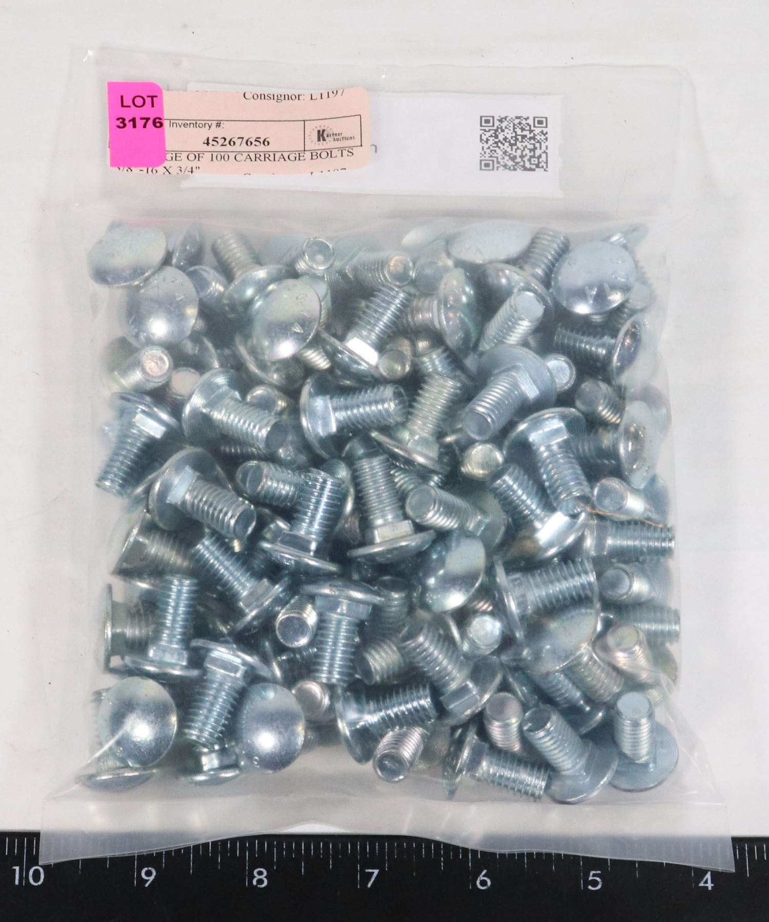 PACKAGE OF 100 CARRIAGE BOLTS 3/8"-16 X 3/4"