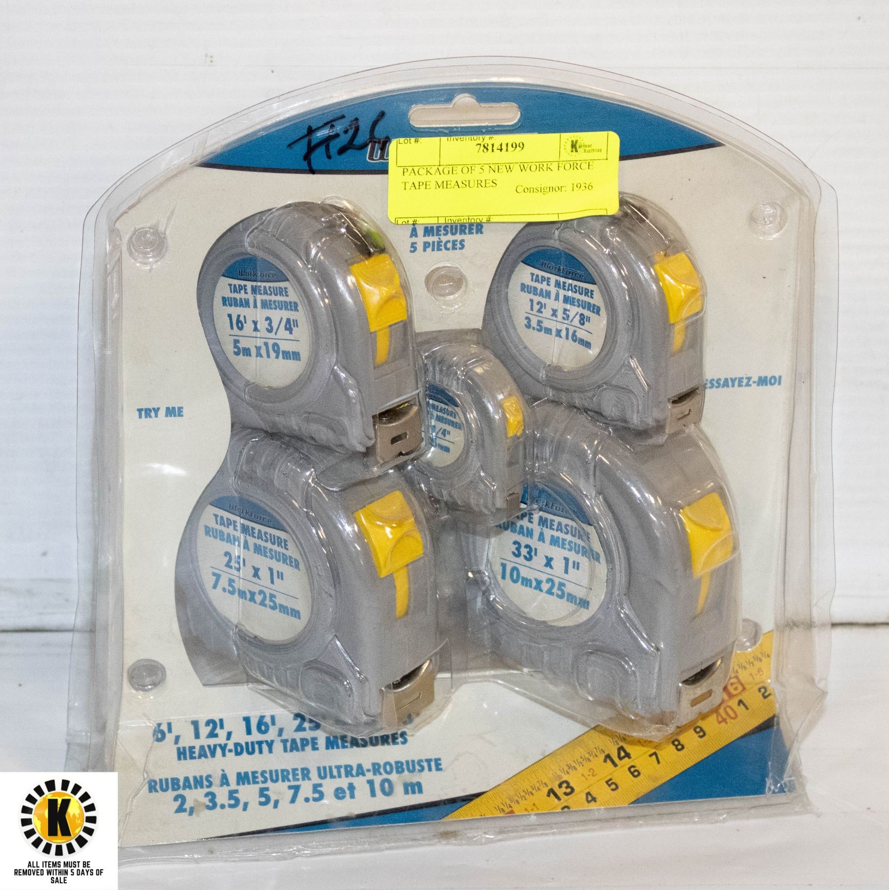 PACKAGE OF 5 NEW WORK FORCE TAPE MEASURES