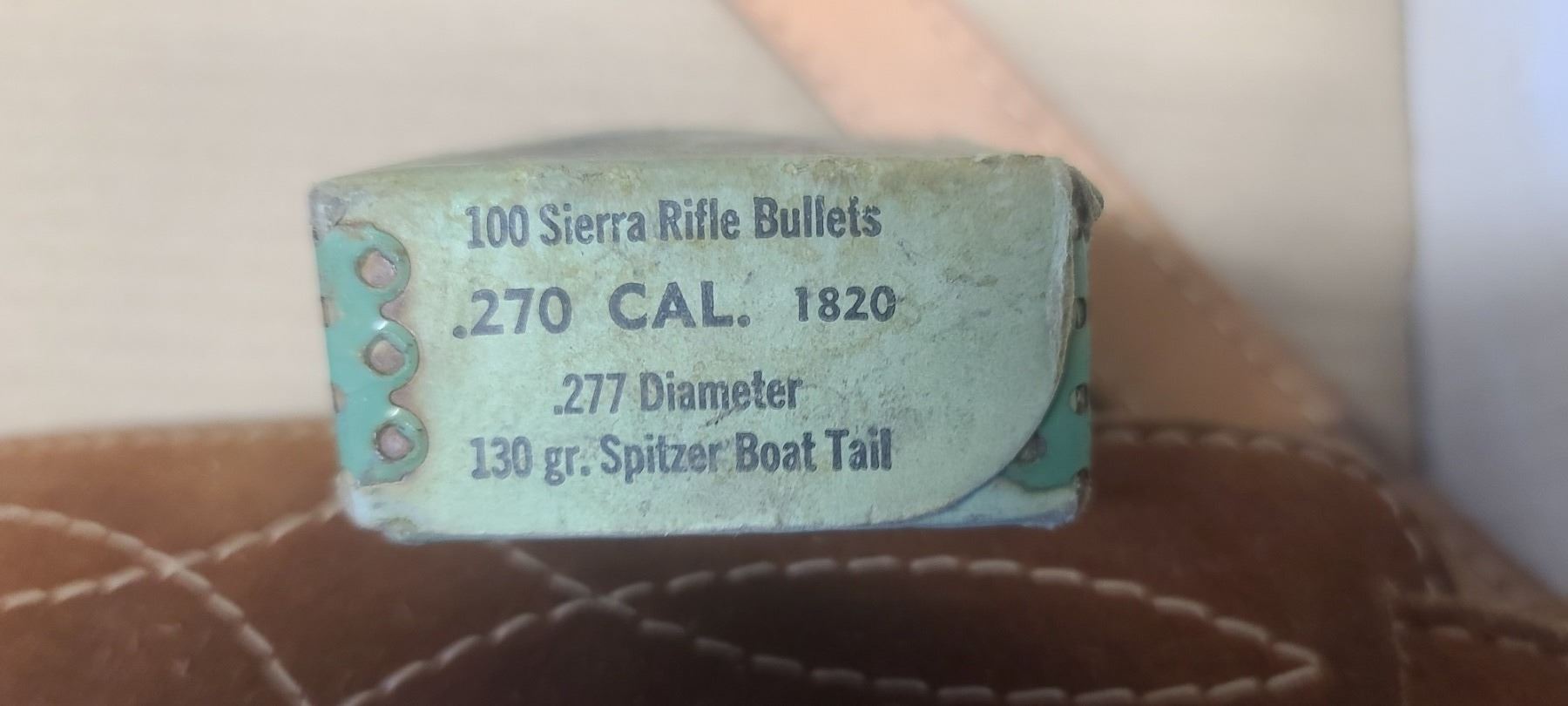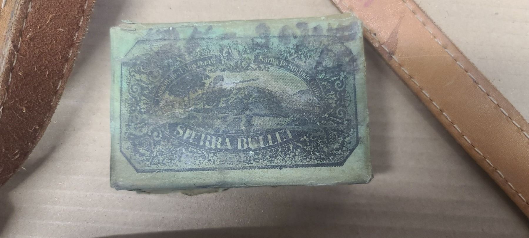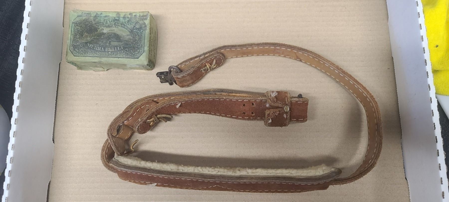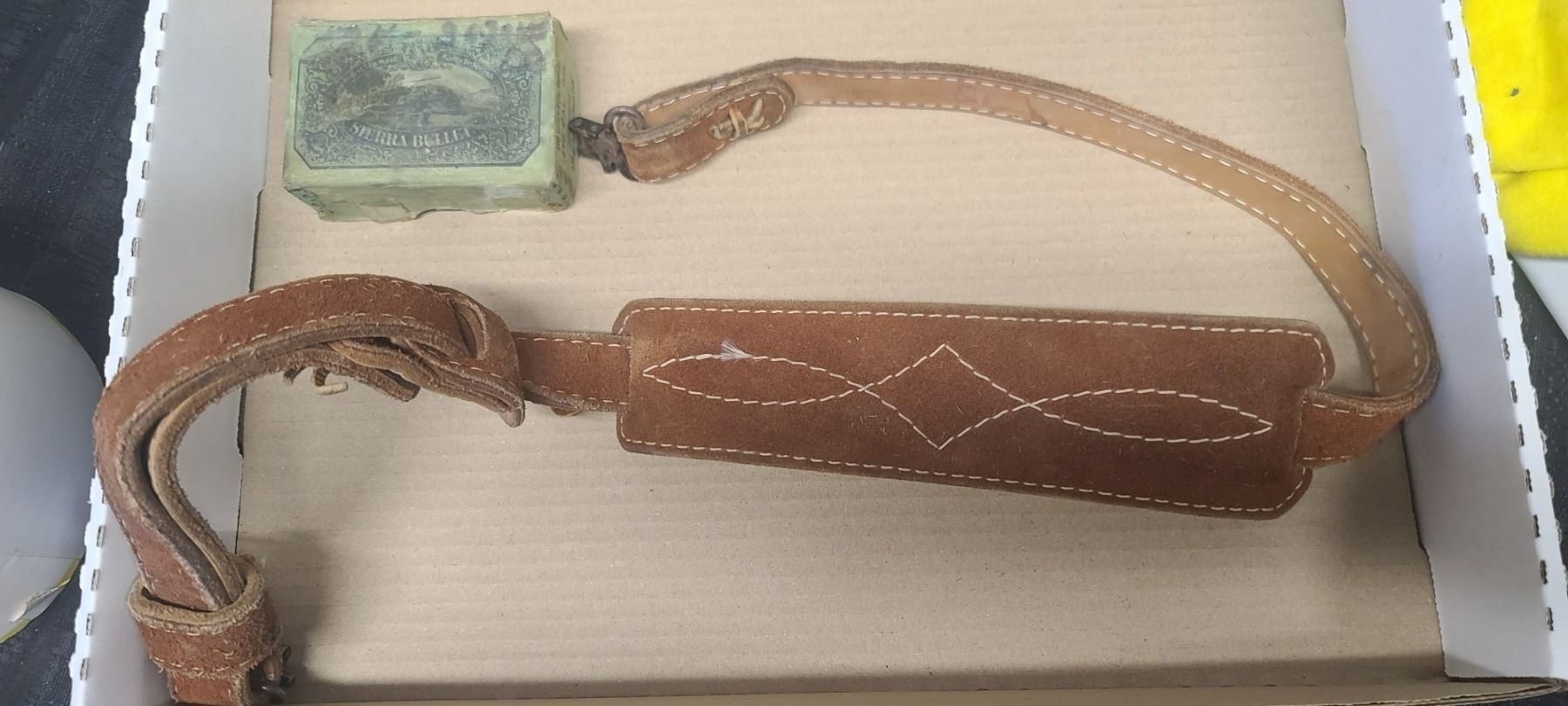 PADDED LEATHER GUN SLING & .270 CAL. 1820 SIERRA BULLET BOX (EMPTY)