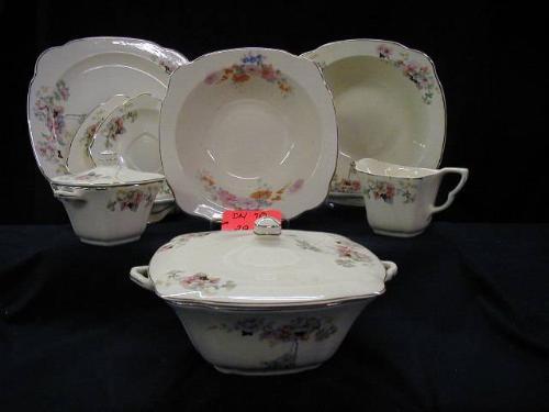 PADEN CITY inREGINAin I32 SET INCLUDES (8) 9 3/4in SQ. PLATES, (8) 6 3/8in BREAD PLATES, (7) SAUCERS, (1) 8 1/2in SERVING BOWL, (1) 8 3/8in inCARNATIONin SERVING BOWL (DIFFERENT PATTERN), (1) COVERED DBL. HND. SERVING DISH (LID HAS STRESS CRACK & UNDER RIM CHIP