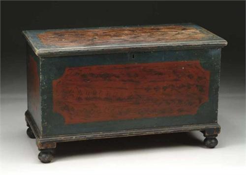 PAINT DECORATED BLANKET CHEST. The six board blanket chest supported by four turned feet is decorated in blue paint with red painted panels having black highlighting to simulate mahogany. Dovetailed case, interior fitted with lidded till. Decoration to sides, front and top. Probably of Virginia origin. SIZE: 21-1/4” h x 35” w x 17” d. CONDITION: Some minor wear to top, otherwise very good. 9-26428