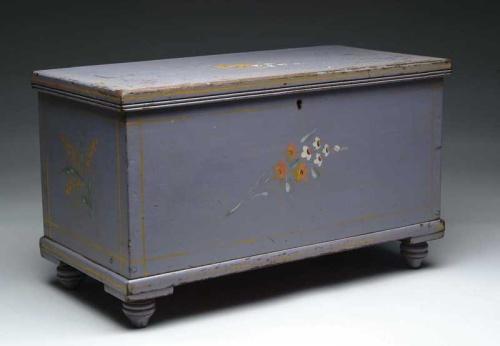 PAINT DECORATED CHILD’S BLANKET CHEST. Light gray paint with hand painted flower sprays. Applied molded edge top opens to reveal lidded till. Molded edge base with four short turned feet. 19th Century. SIZE: 14-1/2” h x top 24-3/4” x 12-1/2”. CONDITION: Some paint wear to edges, generally very good. 9-27605