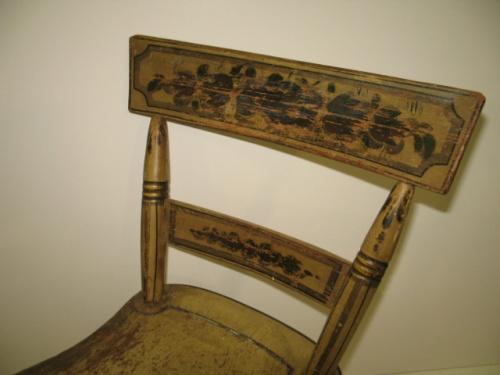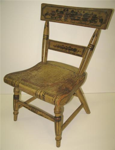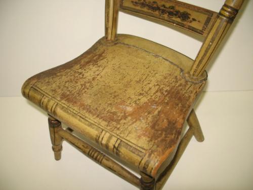 PAINT DECORATED CHILD'S CHAIR. Retains original yellowish paint with black and green stenciling with floral decoration at top of back. Shows wear and loss to paint throughout. 19" H to top of back, 11.5" W