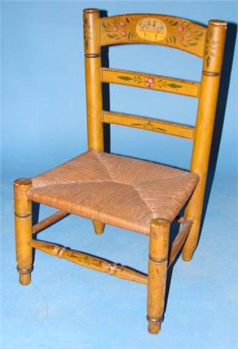 PAINT DECORATED CHILD’S CHAIR WITH LANDSCAPE AND FLORAL DECORATION ON MUSTARD GROUND. Excellent condition with usual wear. Overall 20.25” H.