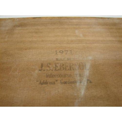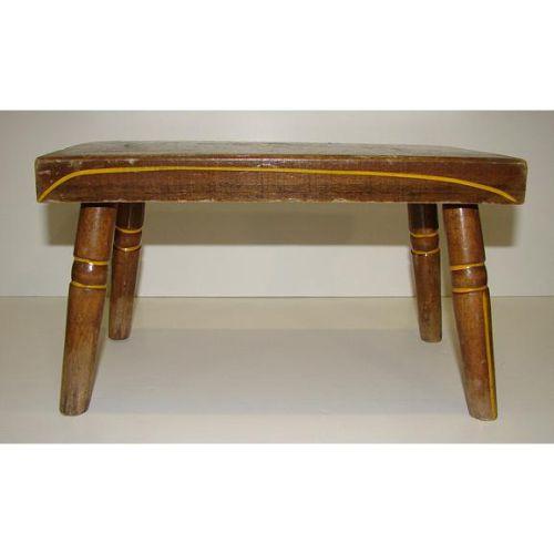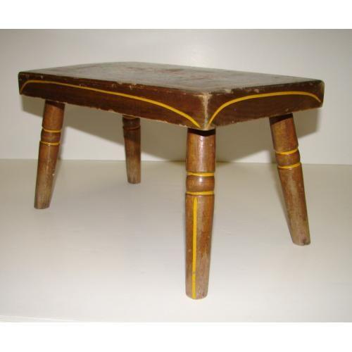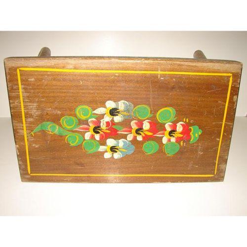 PENNSYLVANIA PAINT DECORATED FOOTSTOOL. Hand painted floral decoration at top with yellow stenciled decoration at top and at legs. Shows wear to top and legs. Stamped on bottom “1971/Built by/J.S. Ebersol/Intercourse, Pa./Address Gordoville, Pa.”. 7” H, 12” L, 7” W