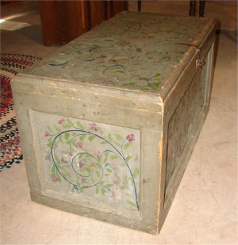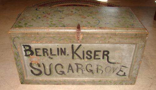 PAINT DECORATED TOOL CHEST. Painted text on front reads “Berlin. Kiser/Sugar Grove”. Painted with bluish gray paint and decorated with blue, green, & cranberry floral & vine paint decoration. Has fitted tool interior. Has four hinges. Inside of lid a