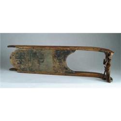 Lot # 607 PAINTED CHILD’S SLED WITH BATTLESHIP. Central panel top has painting of white fleet battleship with two stack and side wheel. Late 19th Century. Cutout hand holes on side runners. SIZE: 46” l x 11-1/2” w. CONDITION: Paint decoration is 50% lost but still discernable. Sled has minor damage through use including old crack in wood side. 9-98577 (200-500)