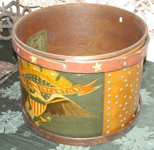 PAINTED REGIMENTAL CIVIL WAR DRUM, with eagle decoration which may be overpainted, retains maker's label, "A. Rodgers" lacking skins, packing and shipping w/i continental USA $40 + insurance SEE OUR WEBSITE FOR MORE IMAGES.