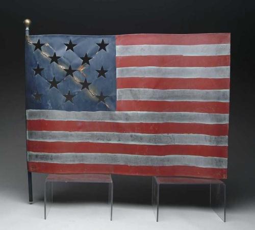 PAINTED COPPER FLAG WEATHERVANE. The mid-20th Century weathervane shows the American flag in wavy form having thirteen stars cutout on the blue field. Seven red stripes with six white stripes. Gold ball finial. SIZE: Bar is 32” h. Flag is 23-1/2” x 34-1/2” l. CONDITION: Minor chipping to surface paint. There has been four welds in between stars. Good. 9-27015