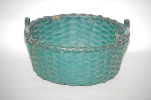 PAINTED DOUBLE HANDLED SPLINT BASKET - 10 3/4" ROUND SPLINT BASKET W/ DOUBLE WRAP RIM & 2 WOODEN STATIONARY HANDLES IN GREEN PAINT (4 3/4" T X 10 3/4" DIA.) - WEAR, MINOR IMPERFECTIONS & LOSSES