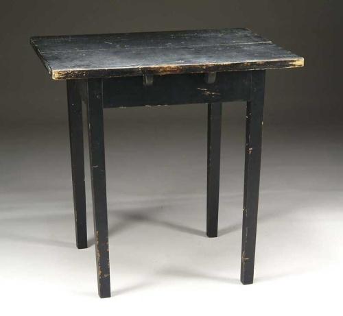 PAINTED HEPPLEWHITE WORK TABLE. Pine work table having original one board top raised on square tapered legs in black paint. SIZE: 28” x 24” top x 28”. CONDITION: Good. 9-26648