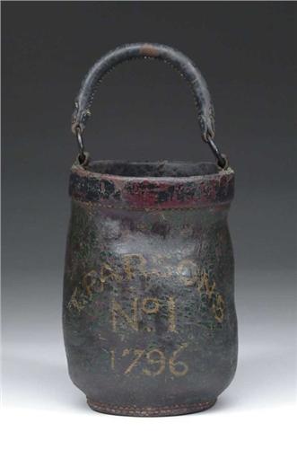 PAINTED LEATHER FIRE BUCKET "T PARSONS 1796".  Body having a green paint with mustard lettering "T Parsons No 1 1796".  SIZE:  10-1/2" h to top of rim.  Handle and rings intact.  CONDITION:  The paint surface has considerable consolidation and shows traces of red amongst the green.  Good.  9-27868