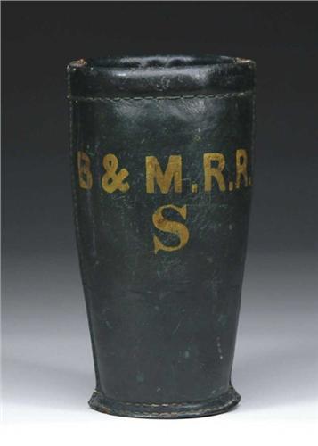 PAINTED LEATHER FIRE BUCKET. "B & M. R. R." Boston and Maine Railroad bucket in green with mustard lettering. Also "S". SIZE: 13-3/4" h to top of rim. CONDITION: Handle is present with rings but unattached. Otherwise very good. 9-27875