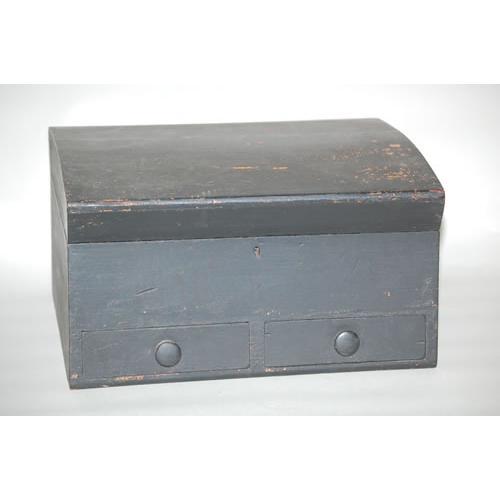PAINTED NEW ENGLAND DOME TOP DOCUMENT BOX - LATE 19TH- EARLY 20TH CENT. PINE BOX W/ 2 SHORT DRAWERS, DIVIDED INTERIOR & CONESTOGA SHAPED DOME LID IN BLACK OVER OLDER PUMPKIN ORANGE PAINT (8.25"T X 15"W X 11.75"D)- WEAR, PAINT LOSSES, IMPERFECTIONS