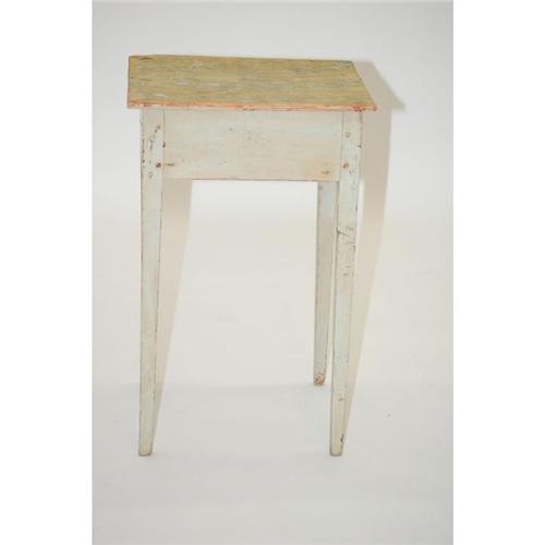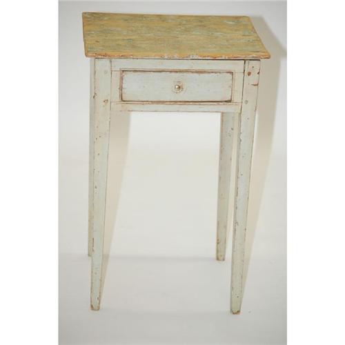 PAINTED NEW ENGLAND HEPPLEWHITE STAND - PRIMITIVE PINE COUNTRY HEPPLEWHITE 1 DRAWER STAND W/ OVERHANGING TOP & SQUARE TAPERED LEGS IN PUTTY OVER OLD RED PAINT W/ TRACES OF OLD GREEN (27"T X 17.25"W X 15"D)-TOP CRACK, WEAR, PAINT LOSS, REPAIRS, IMPERFECTIONS