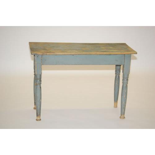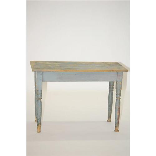 PAINTED NEW ENGLAND SHERATON SIDE TABLE - PRIMITIVE PINE COUNTRY SHERATON OCCASIONAL TABLE W/ OVERHANGING TOP & TURNED TAPERED LEGS W/ BUTTON FEET W/ PALE BLUE PAINT (23.5"T X 31"L X 13.5"W, TOP-34" X 16.75")-WEAR, PAINT LOSS, FOOT LOSSES, IMPERFECTIONS