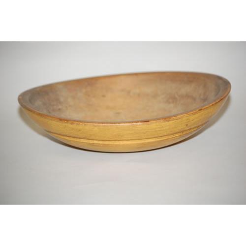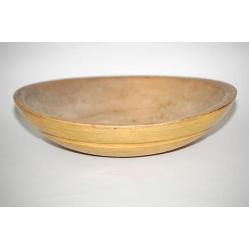 PAINTED NEW ENGLAND WOODEN BOWL - 19TH CENT. TURNED MAPLE BOWL W/ CHANNEL GROOVED EXTERIOR CARVING IN LATER MUSTARD PAINT (3" T X 11 3/4" X 11") - 3" RIM CRACK, WEAR, IMPERFECTIONS