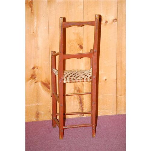 PAINTED PRIMITIVE YOUTHS HIGHCHAIR - 19TH CENT. YOUTH LADDERBACK HIGHCHAIR W/ 2 SHAPED RUNGS, SQUARE LEGS & BACK RAILS, SLANTED ROD ARMS & REPLACED WOVEN GUT SEAT RED PAINT (PROB. CANADIAN)(36" T X 13" W X 12" D)-WEAR & PAINT & OTHER LOSSES, IMPERFECTIONS
