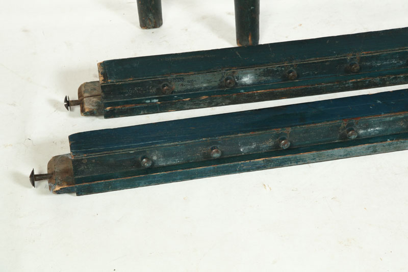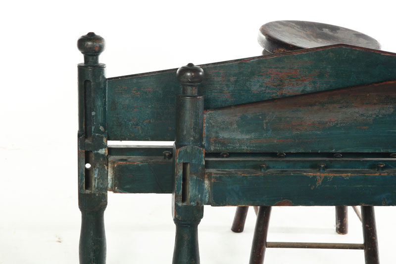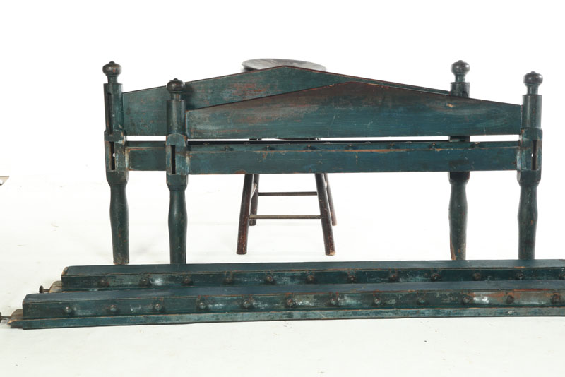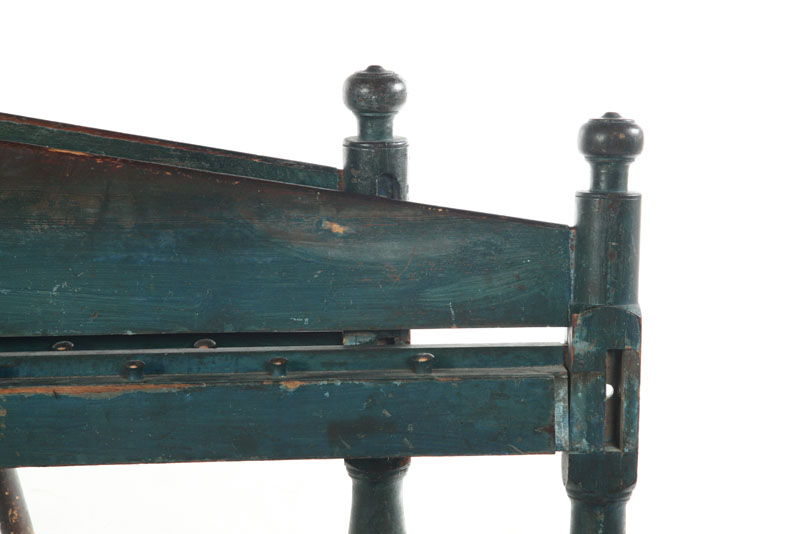 American, 1st-half 19th century, poplar and pine. Turned posts, peaked head and footboards and original rails. Old blue green paint over original light blue-grey. Imperfections. 28"h. 50 1/2"w., rails are 69"l.