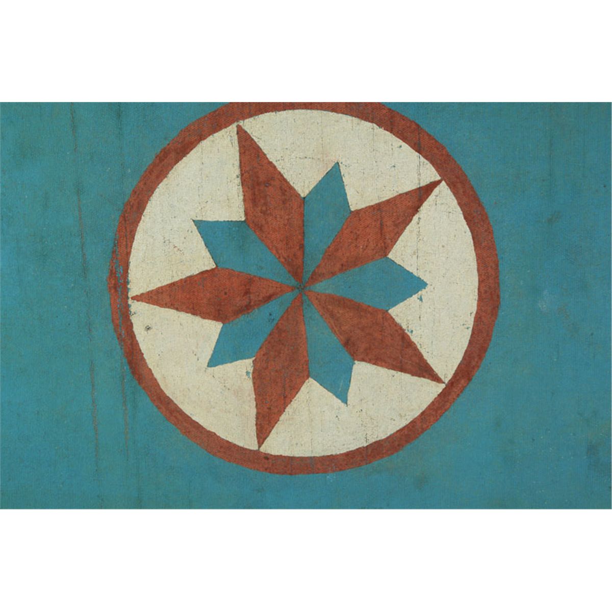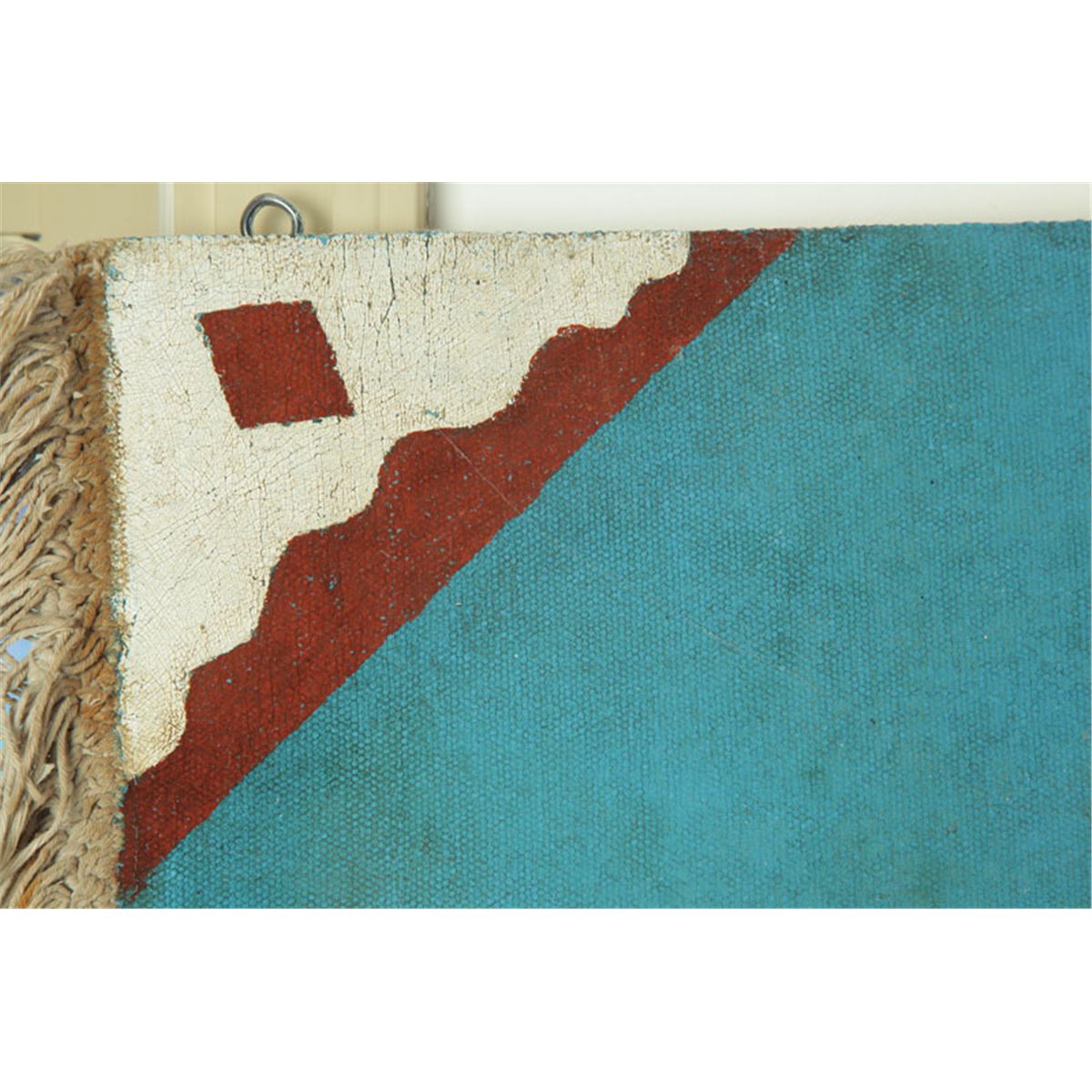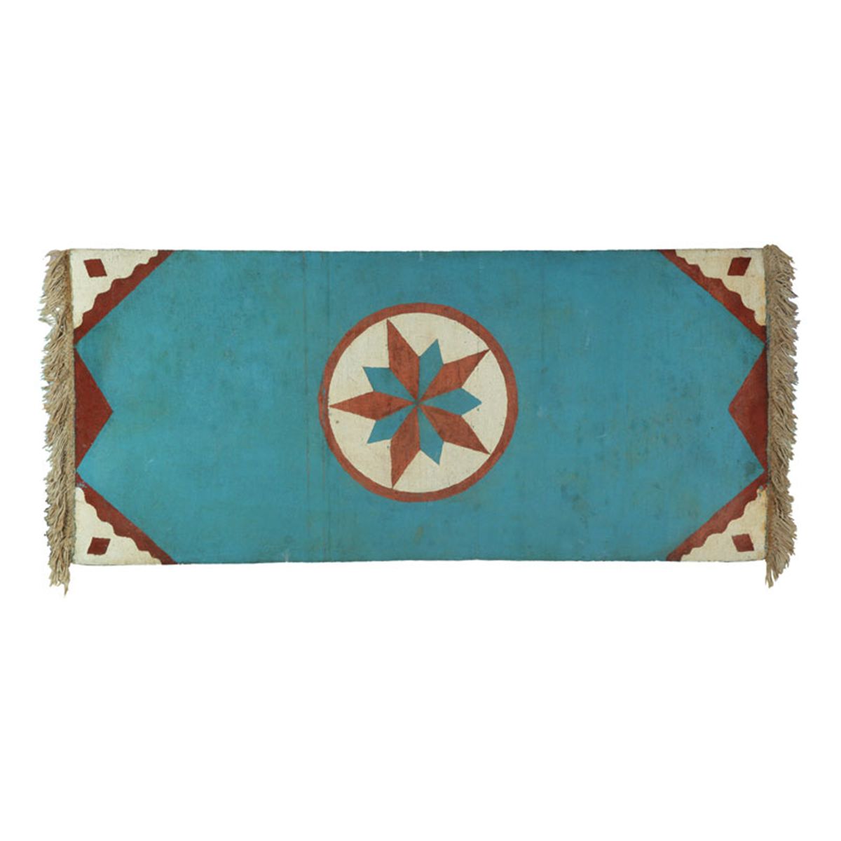 American, 19th century. Painted canvas, geometric, red, white, and blue, and fringed. 23"h. 49"w. Ex Chris Huntington (Maine), ex Thomas Moser (Maine).