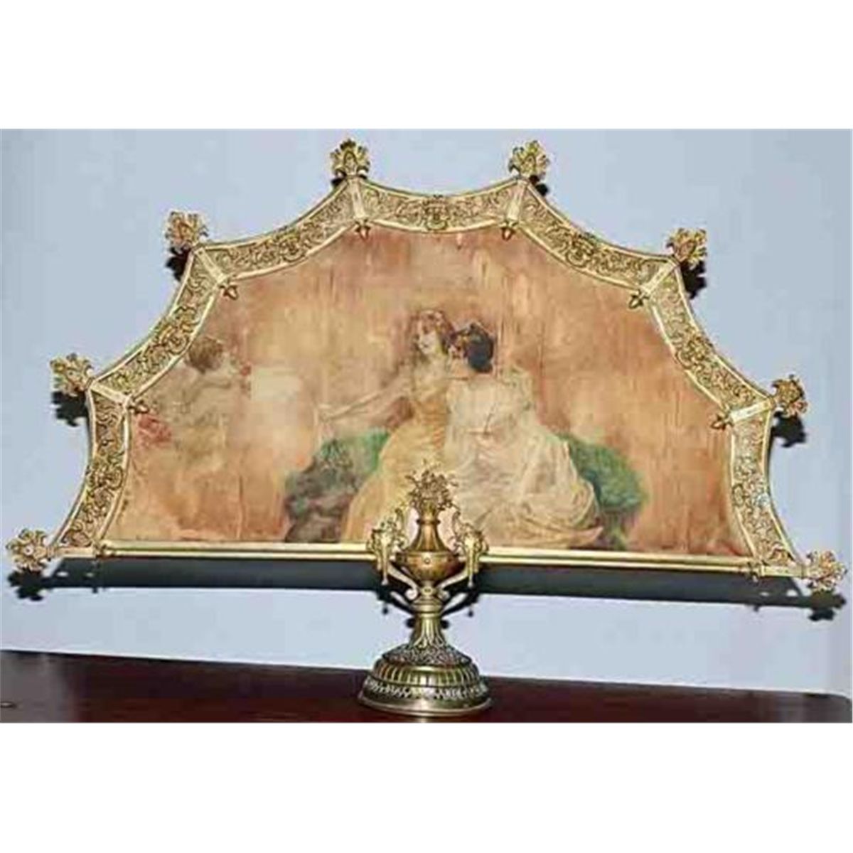 PAINTED SILK & BRONZE FIREPLACE SCREEN, H 28~, W 40~:Painted figural scene. Pedestal base. Fan shape. RP204