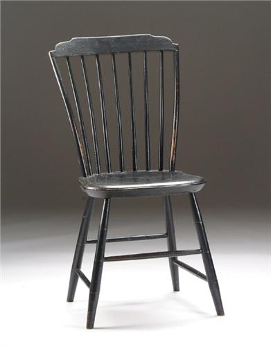 PAINTED STEP-DOWN WINDSOR SIDE CHAIR. Greenish/black old and possibly original paint. Seven spindle back, bamboo turned splayed legs with similar stretchers. SIZE: 35-3/4in. h x 17-3/4in. seat h. CONDITION: Very good. 9-26206