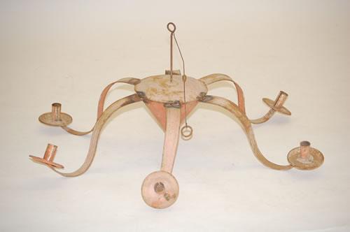 PAINTED TIN CANDLE CHANDELIER - EARLY 20TH CENT. COLONIAL STYLE 6-BRANCH CANDLE CEILING CHANDELIER W/ CONE CENTER, GOOSENECK ARMS, CANDLE CUPS & WIDE BOBECHES IN SALMON PAINT (14" T X 33" W) - WEAR, REPAIRS, BREAKS, IMPERFECTIONS