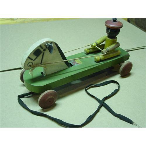 THE 30'S TOY IS IN VERY GOOD ORIGINAL CONDITION,THE PAINT IS GREAT, IT STILL HAS ITS DECAL, THE HORSE IS MISSING ONE OF HIS EARS THERE IS A LITTLE WEAR HERE AND THERE BUT NOTHING SERIOUS, AS THE TOY IS PULLED THE HORSES HEAD AND THE DRIVER MOVE UP AND DOWN