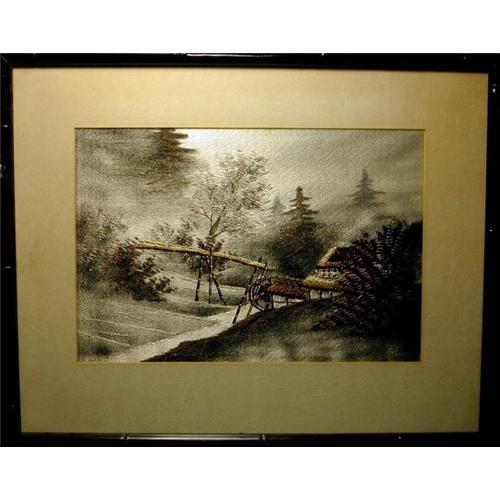 PAINTING IN SILK EMBROIDERY OF A JAPANESE COUNTRY LANDSCAPE<p>An attractive and decorative painting in silk embroidery of muted shades of silver, gray and brown, evoking the emotions and isolation of the deep forest with evergreen and other trees, and transporting the viewer to a Japanese countryside of long ago, and a cottage in the fog-enshrouded misty mountains of Japan. A stream winds its way through the landscape, with a water wheel and aqueduct supported by bamboo legs in view. <p>Condition of this piece is good, with only some minor brown spots of oxidation in the upper sky area. The wood frame shows some wear with age, and is in a black stylized bamboo design with the embroidery under glass.