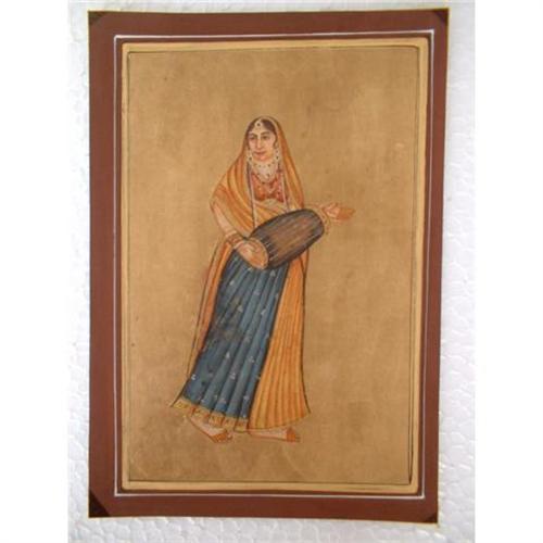 An excellent painting by the artist depicting a joyous mood . The woman is seen standing playing a musical instrument called Tabla .<p>