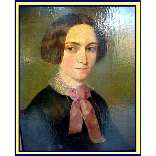 Early American oil painting on board. Portrait of an early Colonial woman. <BR>Painting measures 8 1/2inches wide and 10 1/2inches long. Comes in ornate Rococco style frame, possibly original, measures 14 1/2 X 16 1/2inches.<BR>Sitter wearing dark dress. Good quality fabric and expensive pleats with little ruffled lacy collar and pink ribbon around her neck contrast beautifully with the austerity of the dress. The soft pink and white are beautifully echoed in her complexion. Wide penetrating eyes and soft silky hair, wonderfully depicted with tremendous sensitivity. <BR>No visible signature, but artist of great quality and proficiency. <BR>Condition is very good. <BR>Frame richly adorned with raised flowers, scrolls and shells in undulating, lobed raised form.
