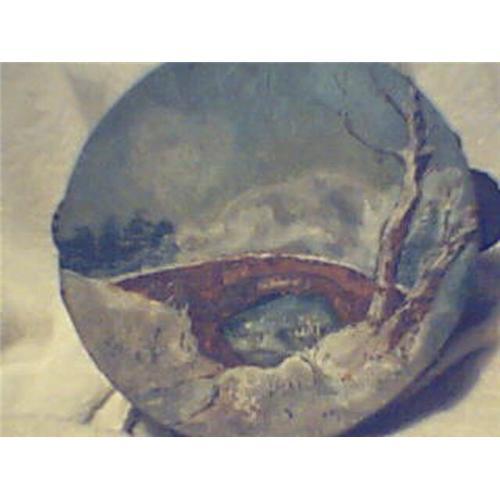 CIRCA. 1930 THIS IS ONE OF THE MOST UNUSAL PIECES. THIS IS A NICE PAINTING OF AN OLD STONE BRIDGE WITH SNOW I GOT IT AT AN ANTIQUE SHOW IN NASHVILLE, TN ABOUT