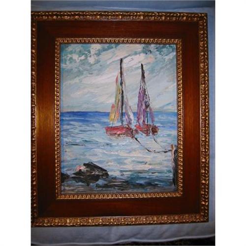 THIS GOOD LOOKING AND VERY PUNCHY PAINTING, HAS NO SIGNATURE. IT IS NOT NEW. BEAUTIFUL AND ELEGANT FRAME AND VERY DECORATIVE. THE FRAME IS MADE OF A FINE WOOD AND IT IS NOT OLD. TOUCH OF WARM GOLD AROUND THE FRAME MAKES IT DELIGHTFUL. GOOD LUCK BIDDING!