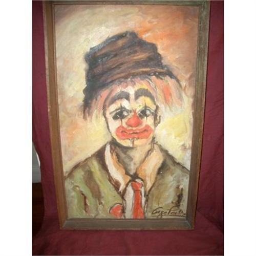 1950S PAINTING ON CANVAS OF A CLOWN VERY VIVID COLORS SIGNED AND ON THE BACK THERES A GIRL ON PENCIL UNFRAMED IS 23 X 13 FRAMED 25.5 X 15.5 E. PAOLINO----GIACOMINO