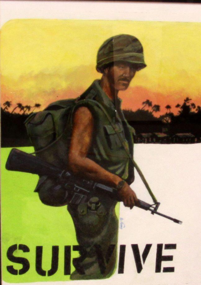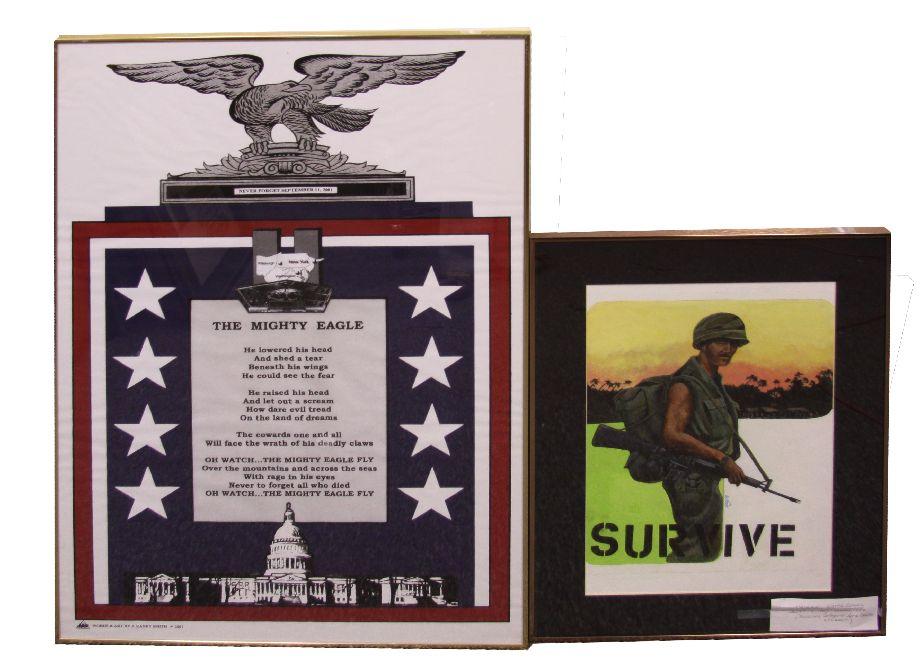 Lot includes two pieces of art. The first is a 1978 painting by L. May of a soldier with the word survive across the bottom 18 x 24 inch. The second piece is a print marking the events of September 11th by J. Randy Smith 24 x 36 inch.