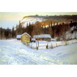 CARL BRANDT 1852-1930, OLJEMÅLNING, HUS I SOLBELYST VINTERLANDSKAP, 90X127, SIGN.